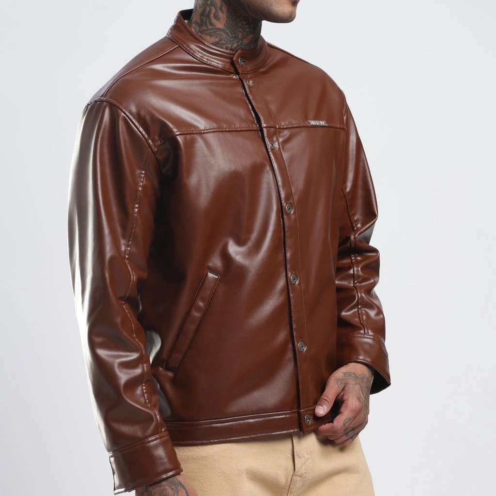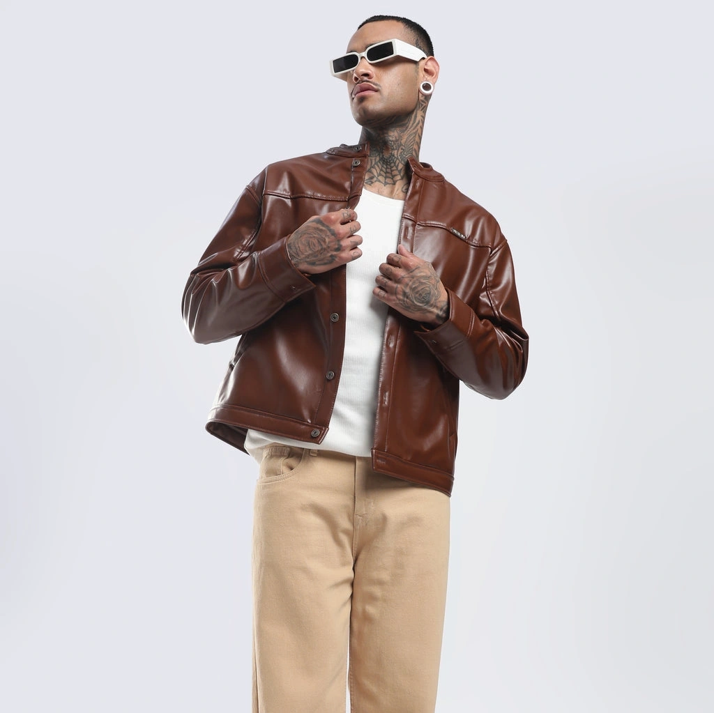 Step into the spotlight with the Tan Leather Jacket. Sleek faux leather, sharp structure, and an refined edge—subtle in shade, powerful in presence.
